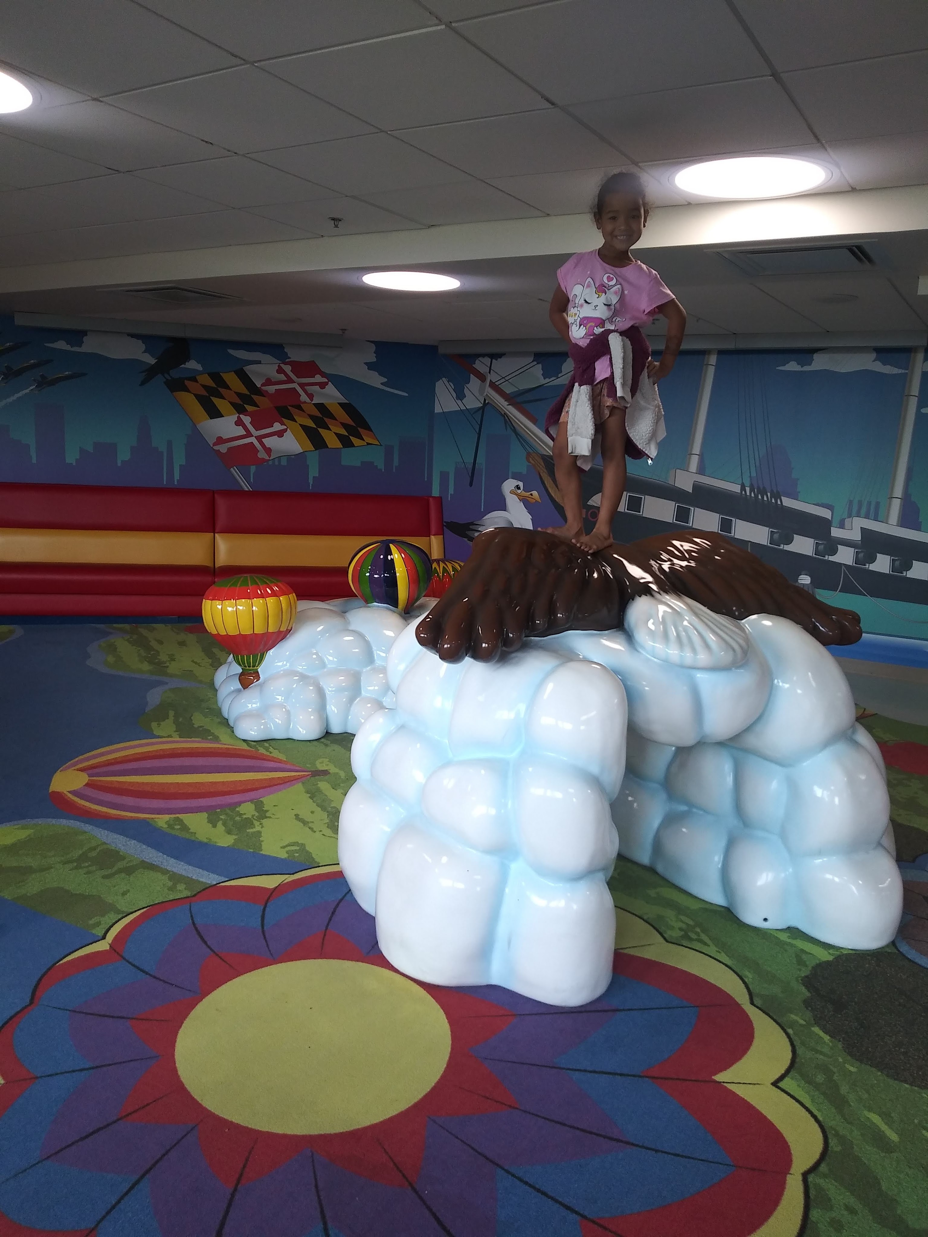 We did a handful of airplane trips to and from MD last year. We discovered there is a play area for the kids at the airport. You’ll find it to the left after getting through security, then straight down the hall you’ll see the play area on the left.