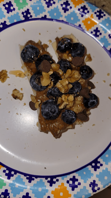 This is a spin off of a banana split. I saw the idea online with yogurt. This version has almond butter, honey, blueberries, chocolate chips and walnuts atop the banana. The topping combinations are endless!