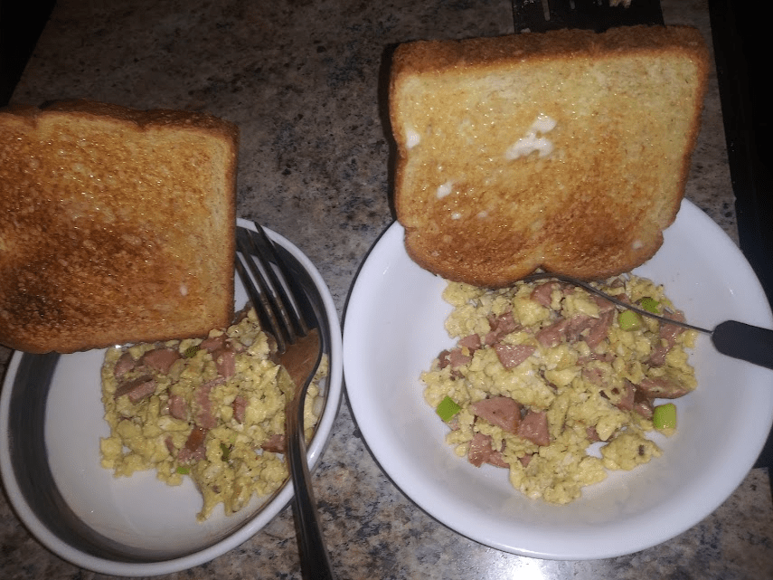 Enjoyable anytime of day, eggs scrambled up are delish. Add some veggies, sausage, bacon and or cheese and you have a meal.