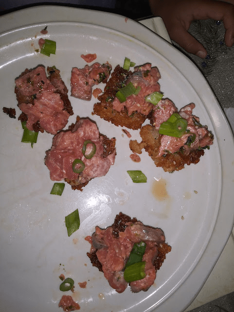My little brother Petey served this dish up one night. It was really good! He fried the rice then put the salmon mix on top. Add the green onion and it makes for the perfect appetizer!