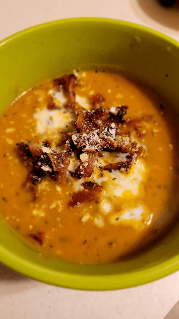 Look at this beautiful soup. Made from sweet potatoes and garnished with crispy bacon!