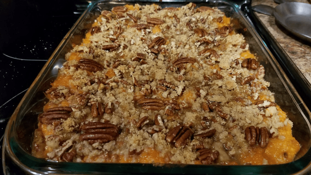 As you can tell, my brother enjoyed making sweet potato dishes! Here is a sweet potato casserole topped with pecans.