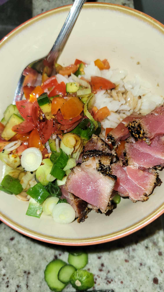 Start with meat of choice, add rice, and other toppings like onions, cucumbers or other veggies. This rice bowl has tuna steak.