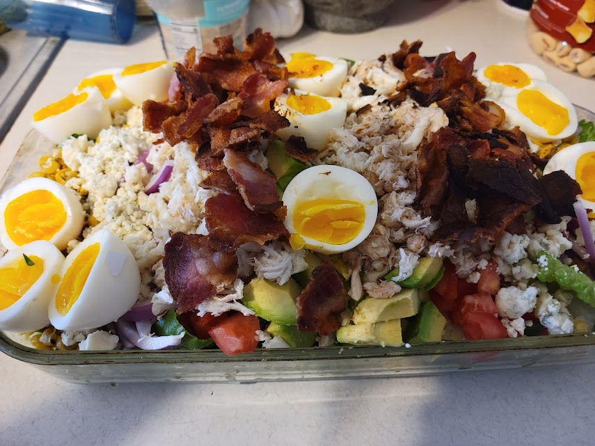 This is a beautiful salad! There’s eggs, chicken, bacon, onions, avocado, lettuce and course cheese.