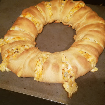 This creation has chicken, bacon and cheese for the filling. The crust came from the premade rolls you can get at the store.