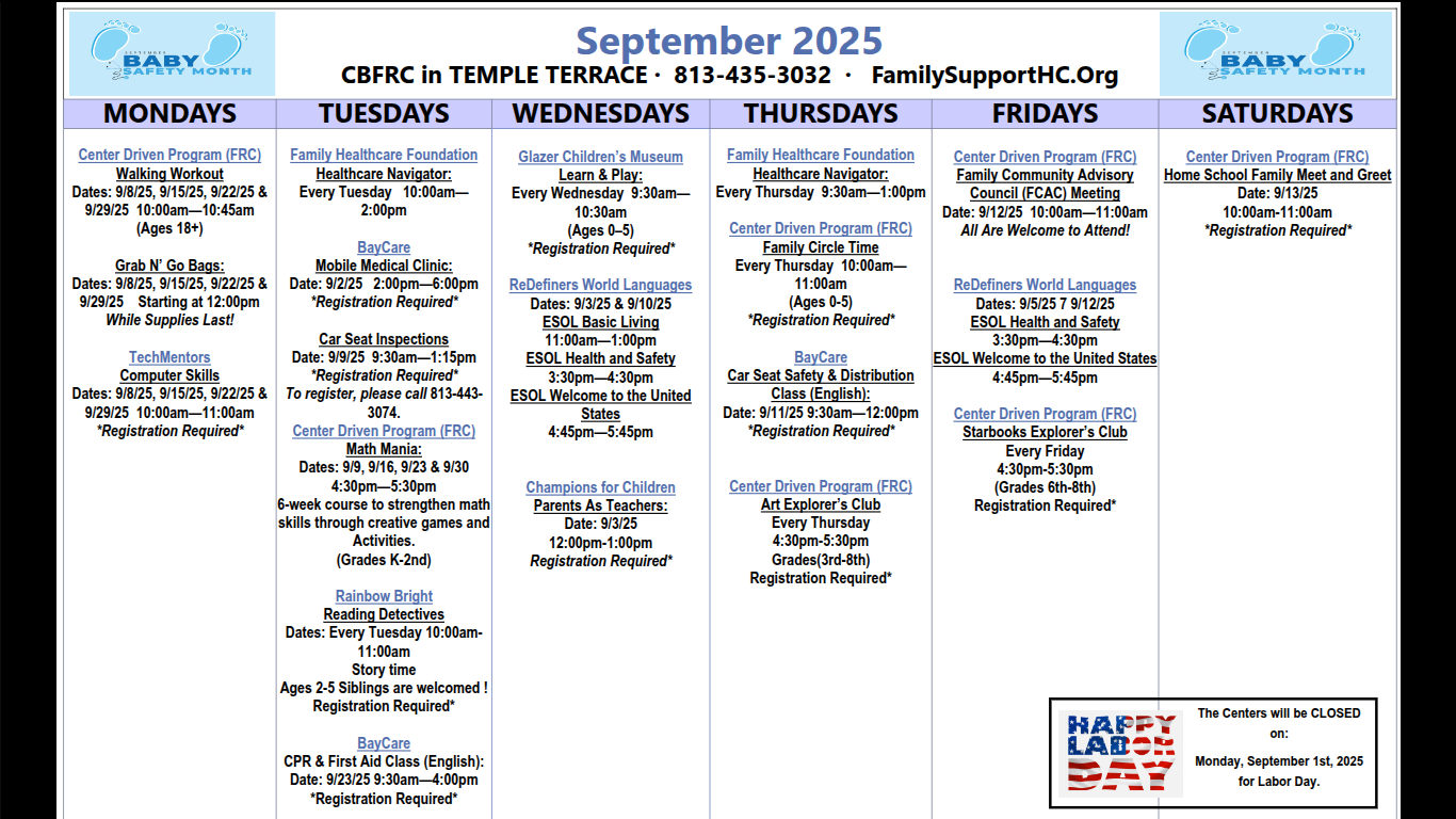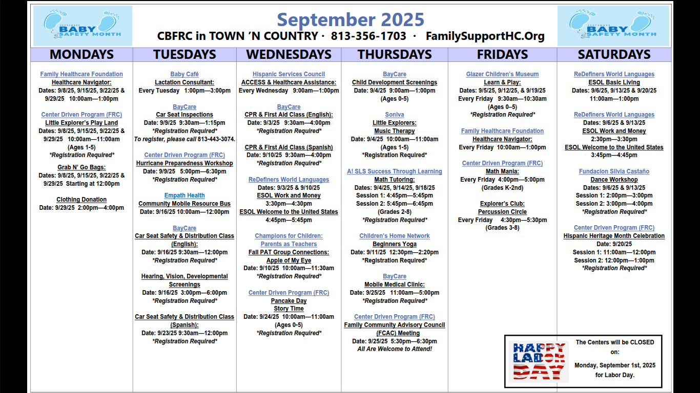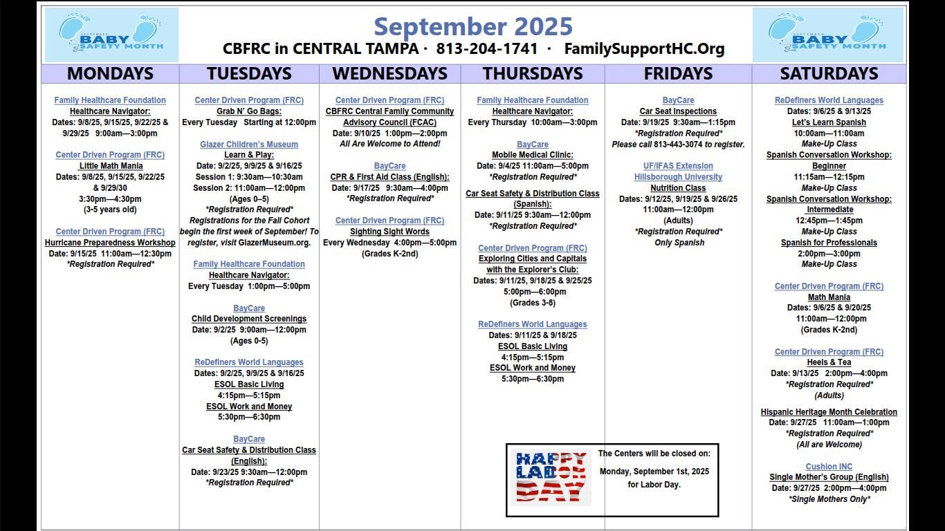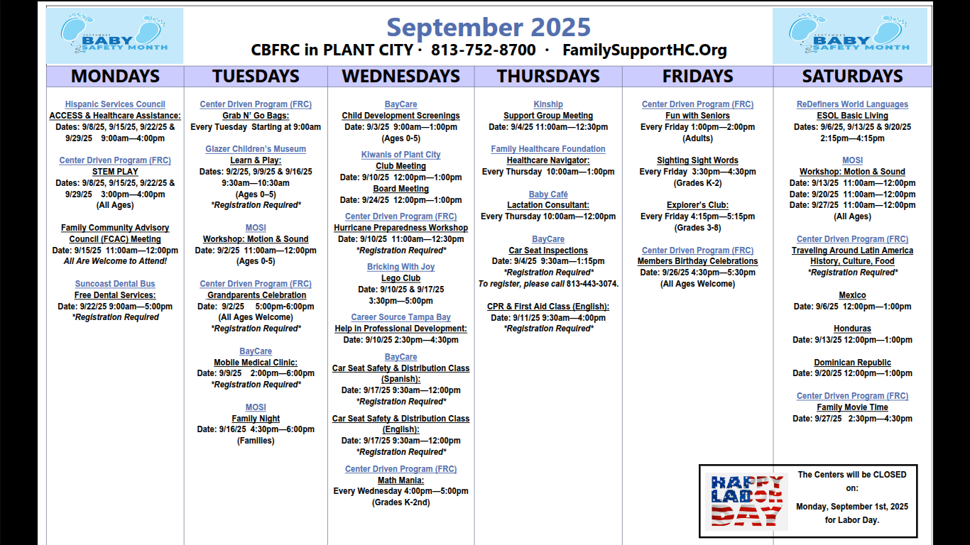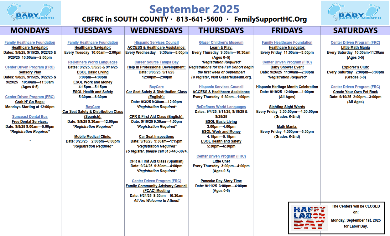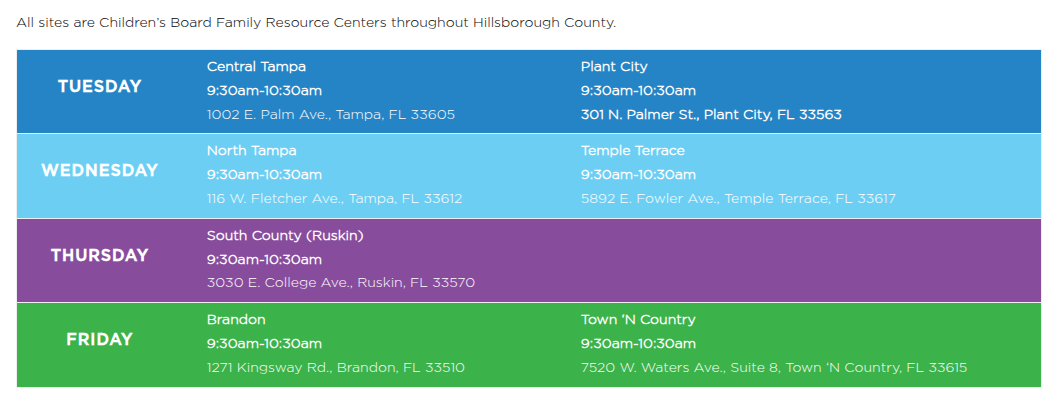 There are seven of these facilities in Hillsborough county that provide free services for families. They offer classes, events, car seat safety, dental services and much more. Click through to see the monthly calendar of events for each individual resource center.
